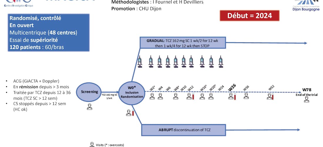 L’essai MAGiCA est un essai de phase 3, multicentrique, randomisé, contrôlé, en ouvert, comparant deux modalités d’arrêt du tocilizumab au cours de l’artérite à cellules géantes (ACG) en rémission sans corticothérapie.