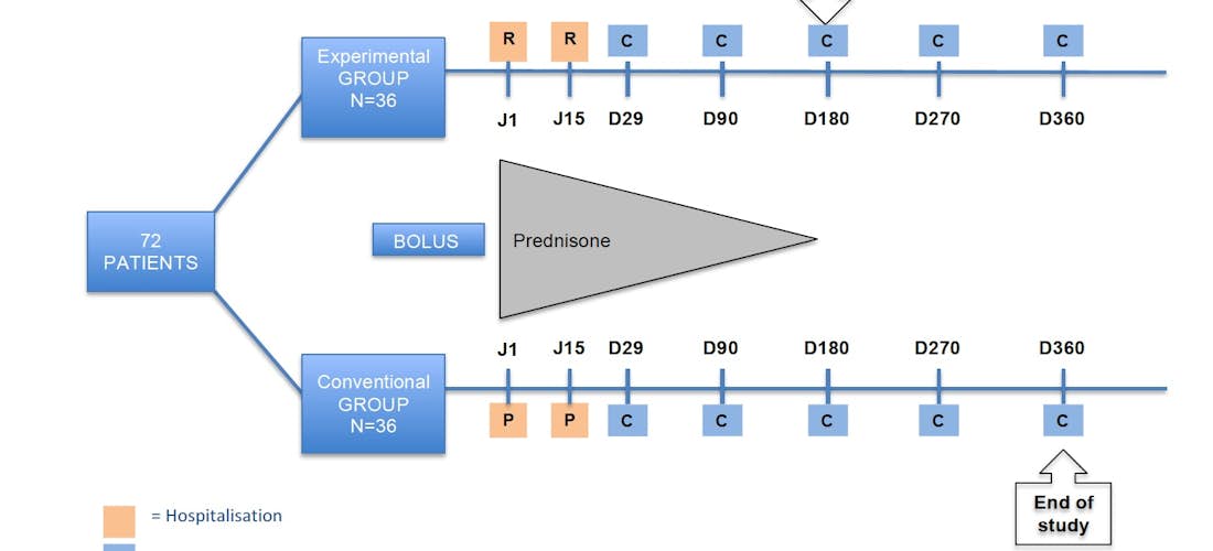 Hypothèse principale : augmentation de 35% de la proportion de patients en RC à J180, c’est à dire 65%, dans le bras rituximab (versus 30% dans le bras corticoïdes).