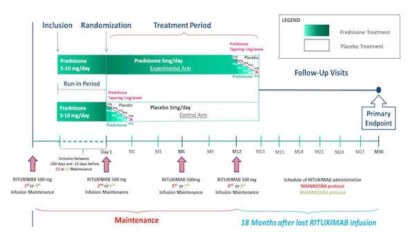 L'étude MAINEPSAN, prospective, multicentrique, contrôlée, randomisée, évalue une administration prolongée de prednisone en traitement d'entretien dans les vascularites systémiques associées aux ANCA.