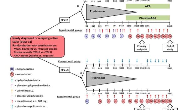 Etude prospective, multicentrique, en double-aveugle, contrôlée, randomisée, comparant un traitement par mépolizumab (anticorps monoclonal anti-IL-5) à la stratégie thérapeutique conventionnelle pour l’induction de la rémission au cours de la granulomatose éosinophilique avec polyangéite (syndrome de Churg-Strauss).