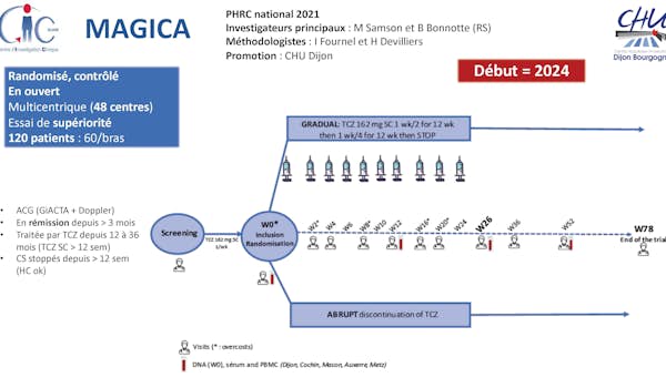 L’essai MAGiCA est un essai de phase 3, multicentrique, randomisé, contrôlé, en ouvert, comparant deux modalités d’arrêt du tocilizumab au cours de l’artérite à cellules géantes (ACG) en rémission sans corticothérapie.