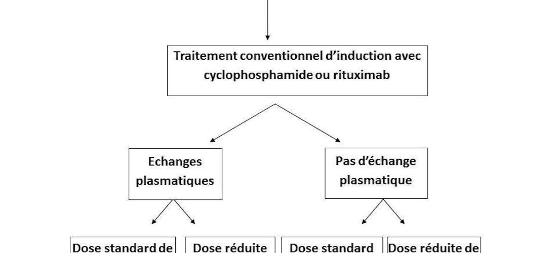 En France, 60 patients seront randomisés pour recevoir un traitement d’échanges plasmatiques en addition des corticoïdes et des immunosuppresseurs ou seulement une association de corticoïdes et immunosuppresseurs, sans échanges plasmatiques. Les mêmes patients seront randomisés pour recevoir une dose réduite de corticoïdes ou une dose standard.